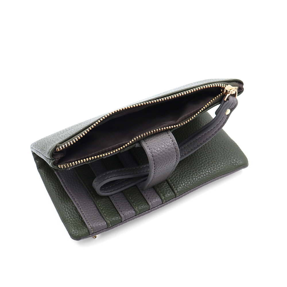 1 db nagy cipzáras rekesz, amely patentos csattal záródik – aprópénz tárolására alkalmas.