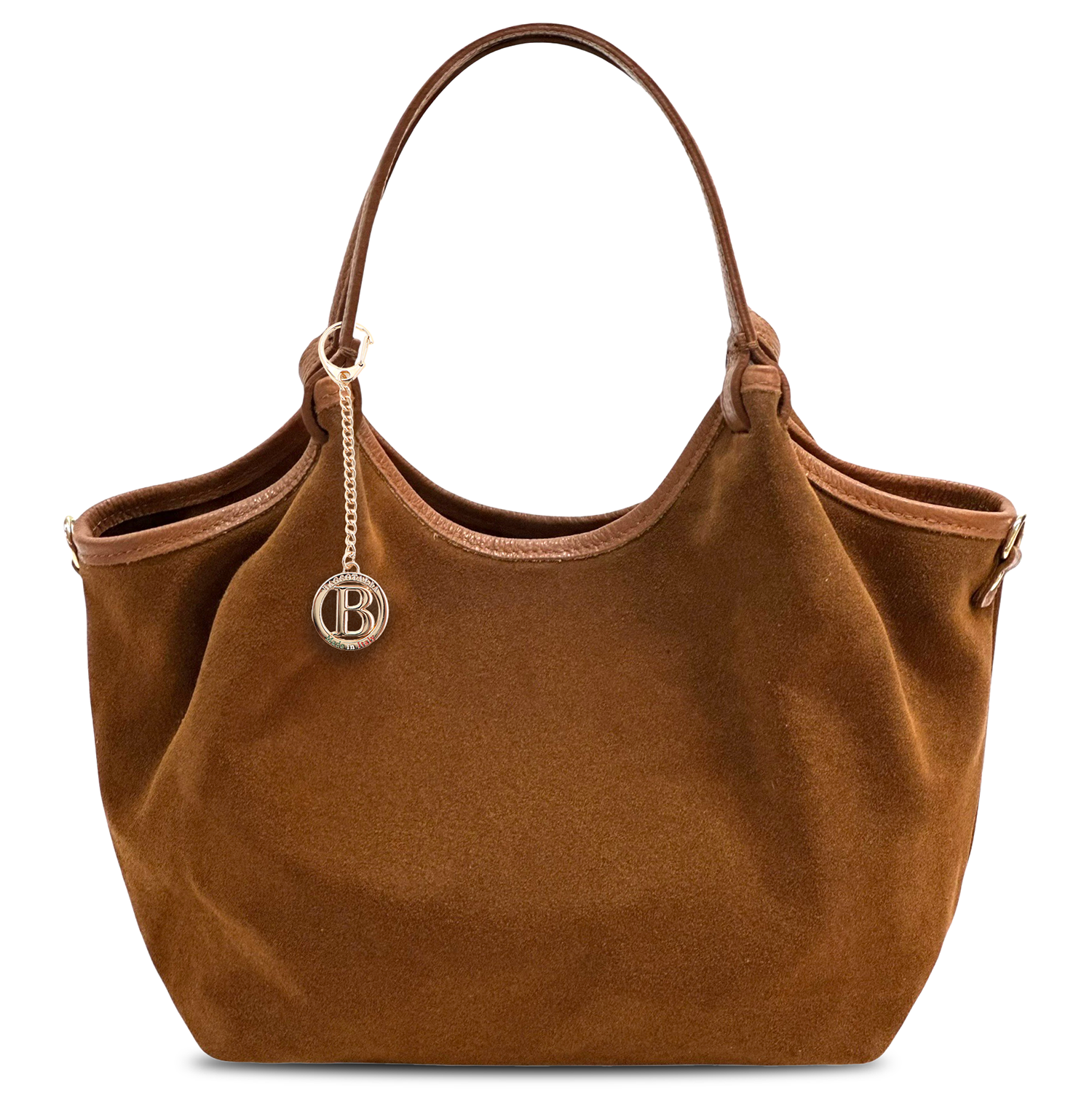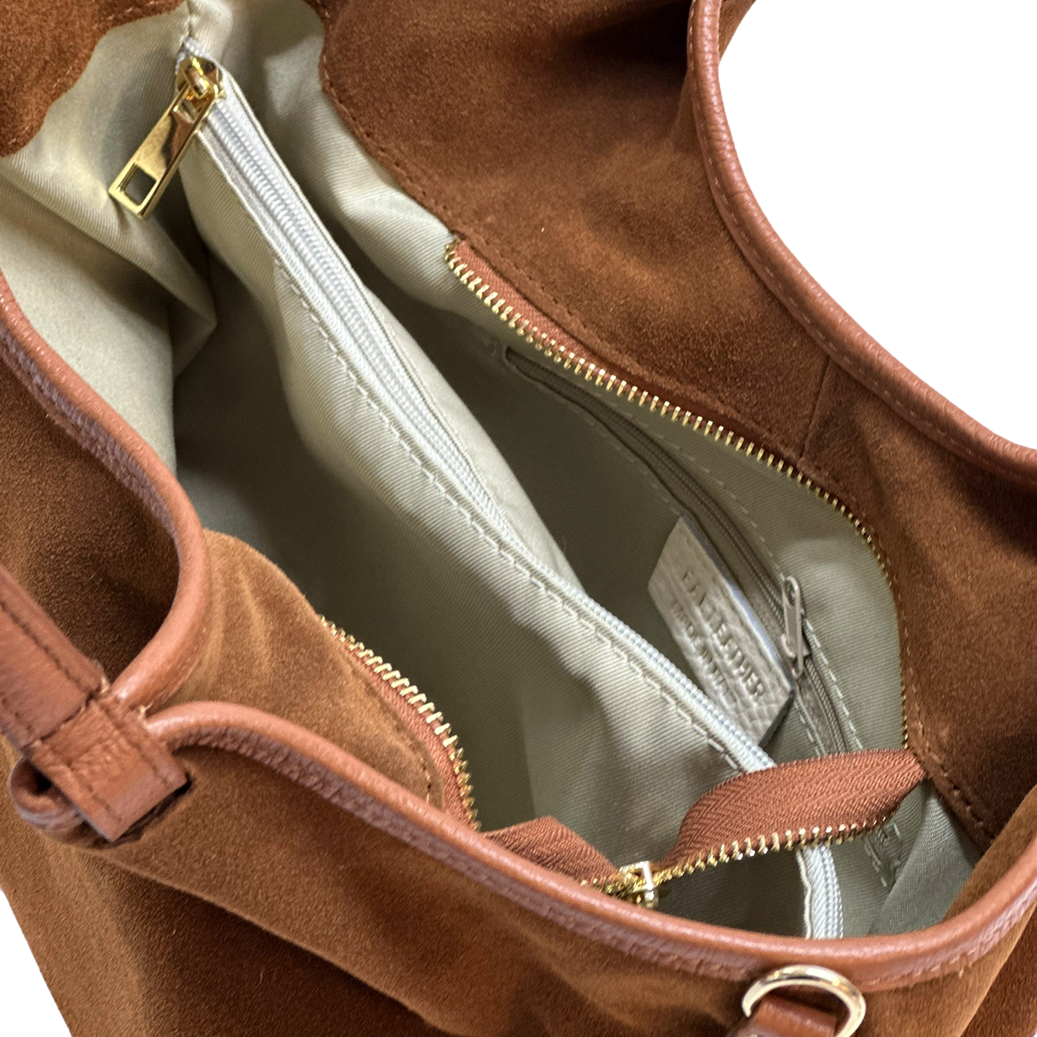 Nagy méretű női táska, zsák fazon, természetes velúrból – téglabarna