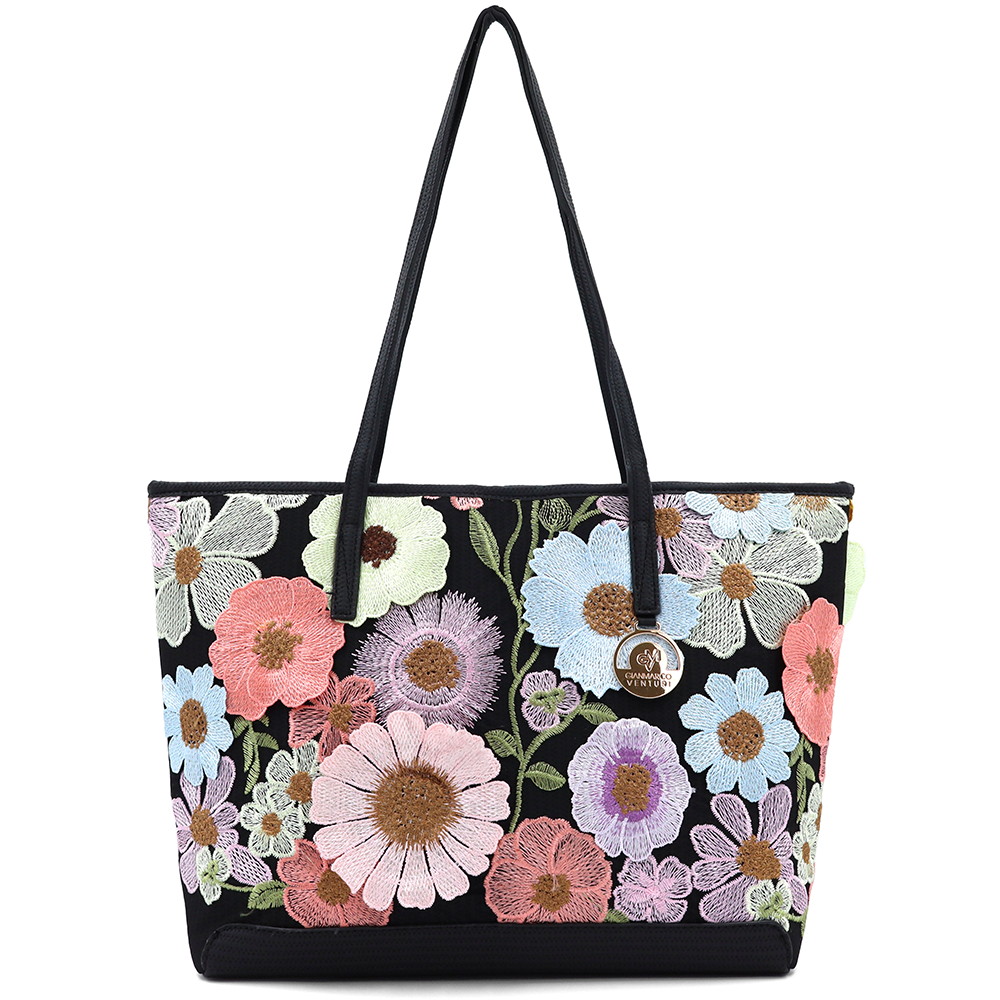 Nagy női táska típusú táska hímzett virágmintával – fekete